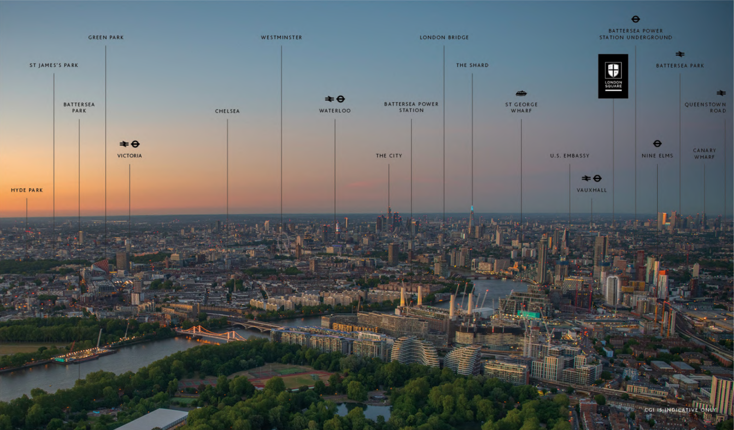 專案位於倫敦一區河岸,與住宅區Chelsea僅一橋之隔。周圍環繞眾多景點,站在岸邊即可看到國會大廈、大笨鐘(Big Ben)和倫敦眼(London Eye),距離威斯敏斯特(Westminster)也開車可達。步行至黑線(Northern Line)延伸站點九榆樹站(Nine Elms),交通樞紐Vauxhall。