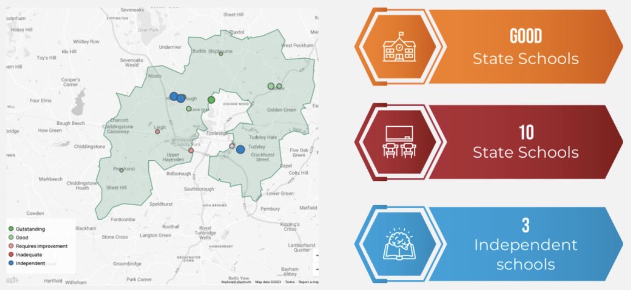 此外,該區還擁有32所完全選擇性的文法學校,像是Cranbrook(克蘭布魯克)、Paddock Wood(圍場木)、Royal Tunbridge Wells(皇家滕布里奇韋爾斯)、Hildenborough(海登伯勒)和Sevenoaks等區域內或約5公里範圍內均有許多優秀的小學和中學,其中包括Tonbridge Grammar School(湯布里奇文法學校)、Tunbridge Wells Grammar School(坦布里奇韋爾斯文法學校)和The Skinners’ School(斯金納學校)等。