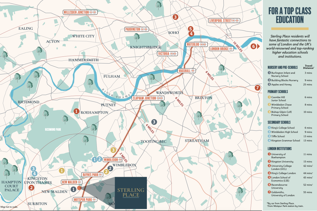 Sterling Place坐落在倫敦西南部新莫爾登New Malden,鄰近溫布頓Wimbledon及京士頓Kingston,新莫爾登35%面積被規劃為綠地,被政府指定為「傑出自然風景區」。從新莫爾登火車站搭車半小時即可抵達倫敦市中心滑鐵盧車站,既提供了近郊的生活品質,亦提供了往返倫敦的便利性。