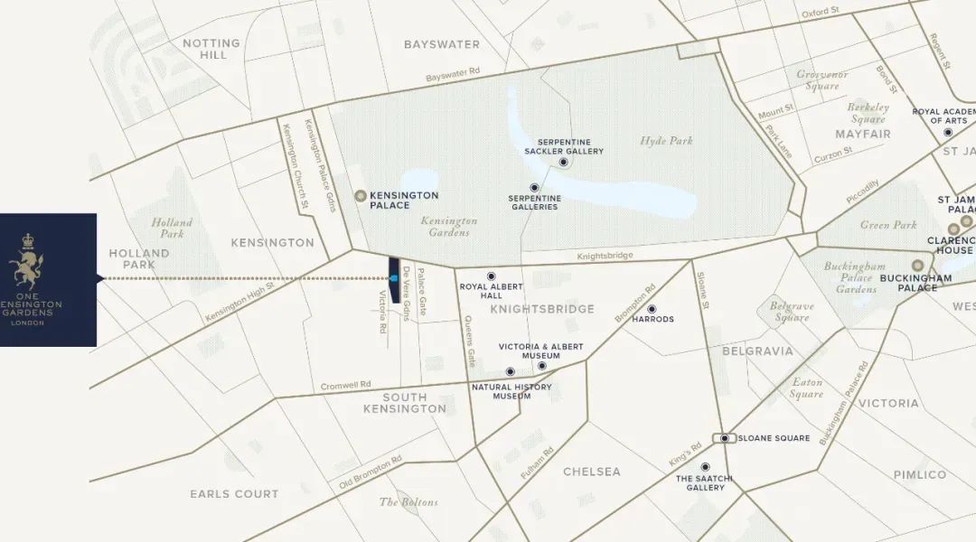 One Kensington Gardens 位於倫敦著名皇家自治區Kensington & Chelsea,計畫坐落於辛頓宮和皇家花園正對面, 步行就能漫步於美妙的肯辛頓花園。在這裡,居民將置身於倫敦璀璨皇家自治區的中心,盡情享受華麗生活。較近的地鐵站High Street Kensington,步行即可抵達。