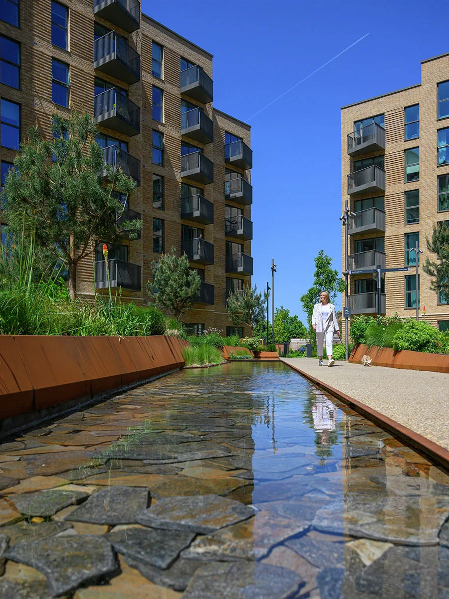 建築外觀保留工業風格,復古氛圍重現城市輝煌往昔。室內裝潢風格時尚典雅,配備設施符合當代都市生活的新標準。每間公寓的廚房均為量身訂製設計,以確保符合人體工學。每套公寓皆設有延伸式戶外陽台,將潺潺流水與繁花庭園盡收眼底。