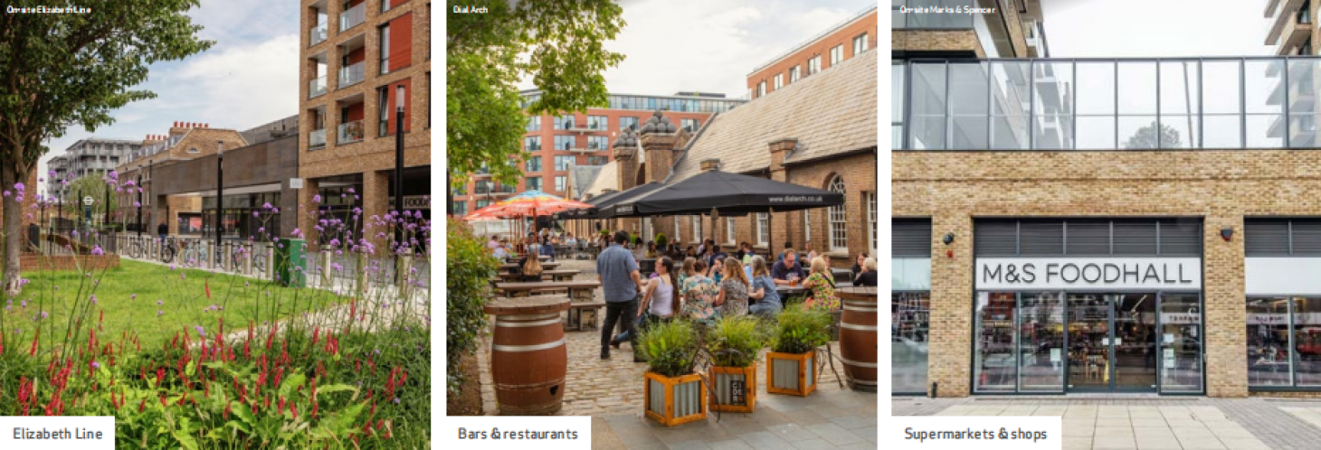 社區內設有豐富的生活便利設施,如瑪莎百貨(Marks and Spencers)、樂購便利超市(Tesco Express)、Sainsbury's超市、咖啡廳、Young's酒吧餐廳,可同時享有兩大社區的生活便利。