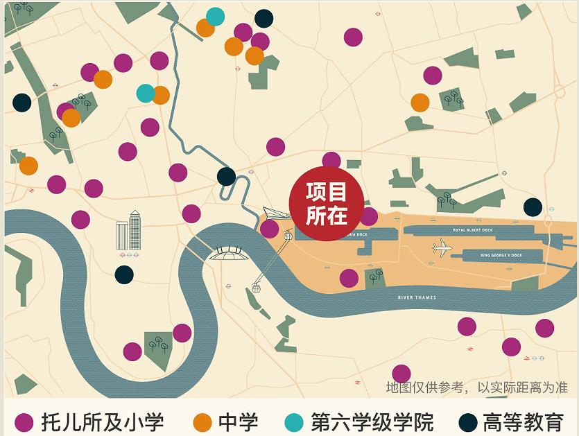 計畫周圍,有30所小學、15所中學,都是英國教育標準局認證的學校,可以滿足各個年齡階段孩子需求。從計畫出發,可達倫敦大學學院UCL、KCL、倫敦政經學院LSE、Queen Mary University 等多所大學